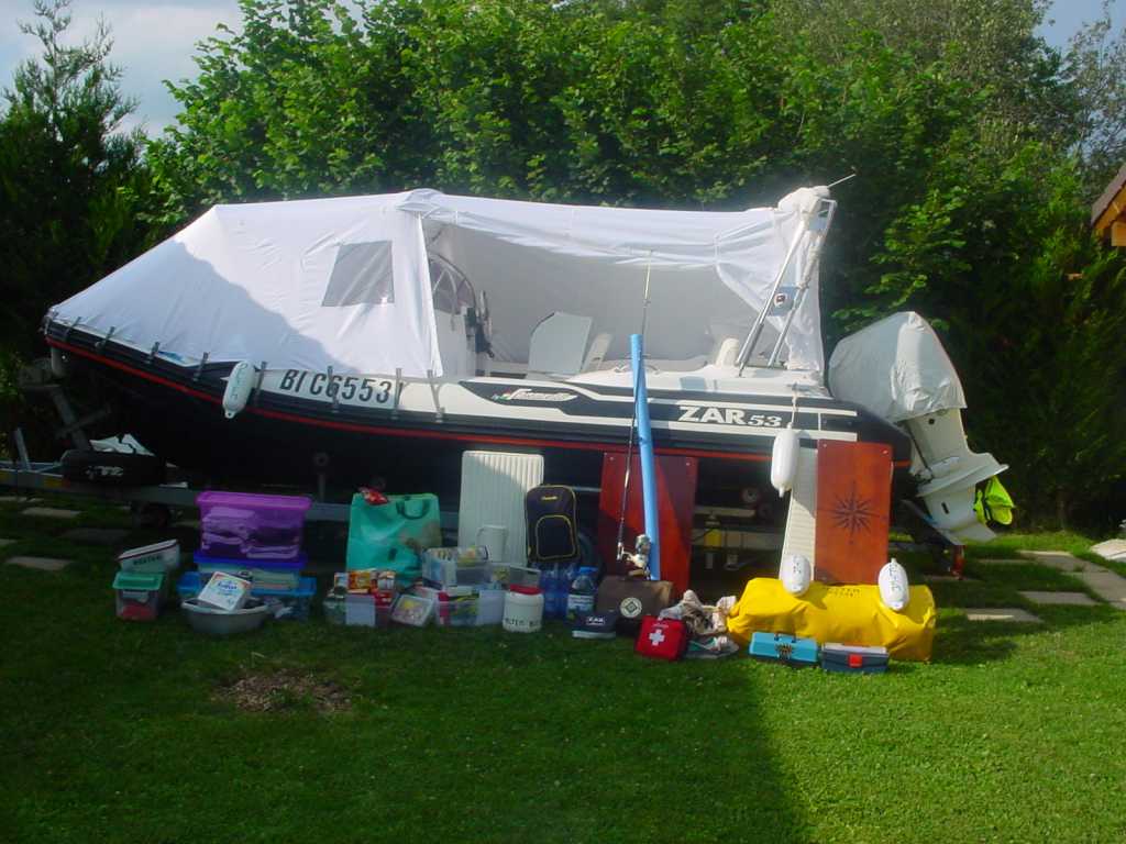 La glacière, le réchaud et quelques gamelles, la nourriture pour une semaine( hormis les "fruits et légumes" et les produits frais (œufs, fromage)achetés sur place. Un pack d'eau une caisse de vin...