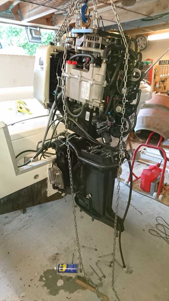 Outillage nécessaire : un palan a chaîne ou chèvre, l'outil de levage Mercury qui se visse dans le volant moteur, un joint de tête motrice Ref:27-43007 (8.5€), un filtre stainer neuf Ref:834808 4 (14€) et quelques clés et tournevis forcément... Je me suis servi de la clé dynamométrique pour resserer les 8 goujons/écrous de la tête à 27Nm.