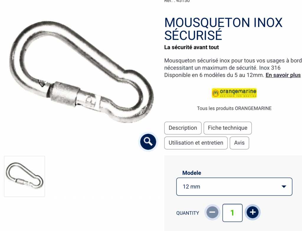 Pour la fixation côté bouée, la liaison se fait toujours directement sur la chaine reliée au peson reposant sur le fond grâce à l'utilisation d'un mousqueton inox vissé avec une clé. Suivant la forme de la bouée, j'adapte un système de secours sur ma ligne de mouillage, en fixant à l'anneau de la bouée soit un 2éme mousqueton, une grosse manille lyre ou si c'est impossible un bout sans tension, au cas où le montage principal rompt.