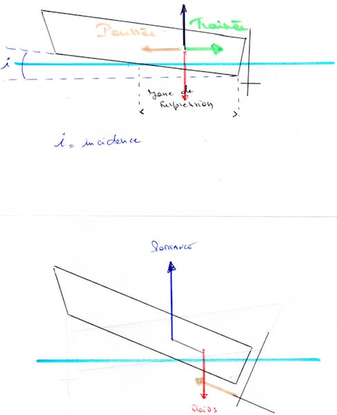 C’est la variation d’incidence des lignes d’eaux dans leurs entrées sous l’étrave qui provoque le cabré à l’accélération et particulièrement au déjaugeage lors du passage de régime de portance "archimédéen" au régime de portance dynamique.