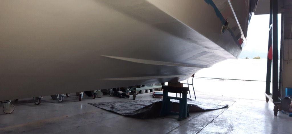 Coque: retouches primaire epoxy sur les traces de gel coat apparentes, et réhausse de la ligne de flottaison à l'avant, trop basse à l'origine