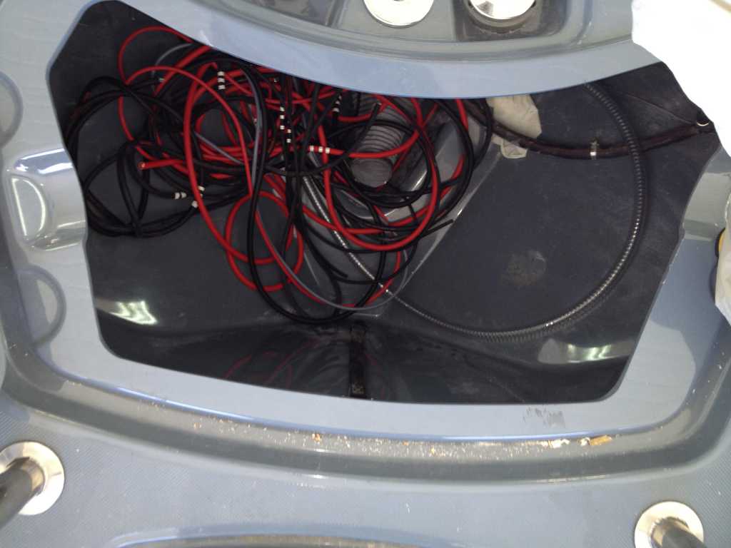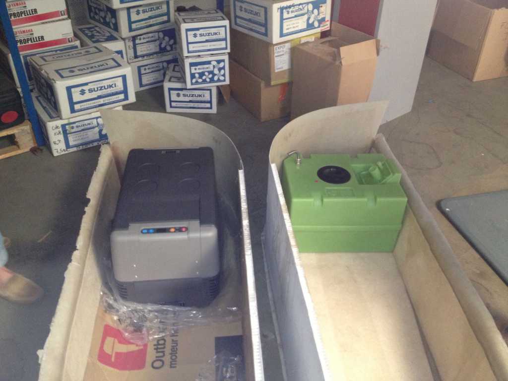 - Coffres AV stratifié nid d'abeille contremoulés sur mesure, amovibles sur inserts; supports bain de soleil / couchage. Ils seront finis après mesure de l'assiette en tangage du canot à charge utile pour les rendre aussi horizontaux que possible :