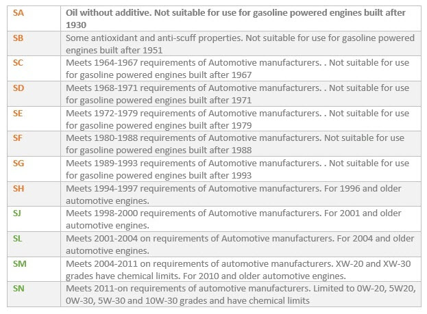 Il existe deux catégories: l'essence et le diesel. Catégorie S "Spark Ignition" pour les moteurs essence et la catégorie C "Compression Ignition" pour les moteurs diesel. Pour les deux, la lettre S ou C est suivie d'une autre lettre. Par exemple, SM ou CF. Plus la lettre est éloigné dans l'alphabet, plus la technologie de l'huile est récente. Pour une huile récente, la spécification plus élevée se substituera au grade inférieur de la lettre. Par exemple, si nous avons une huile avec la spécification SN, elle peut également être utilisee pour les véhicules qui demandent API SM, SL et SJ; elle est rétrocompatible.