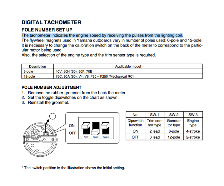 De mémoire je sais qu'il y a un toogle switch derrière le compte tours , réglable en fonction du nombre de pôles du stator mais je ne sais pas si c'est un 6 ou 12 pôles .