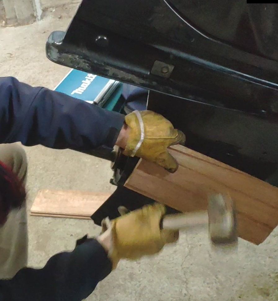 On tape sur le bas avec une masse et une planche en bois pour ne pas tout démolir au premier coup