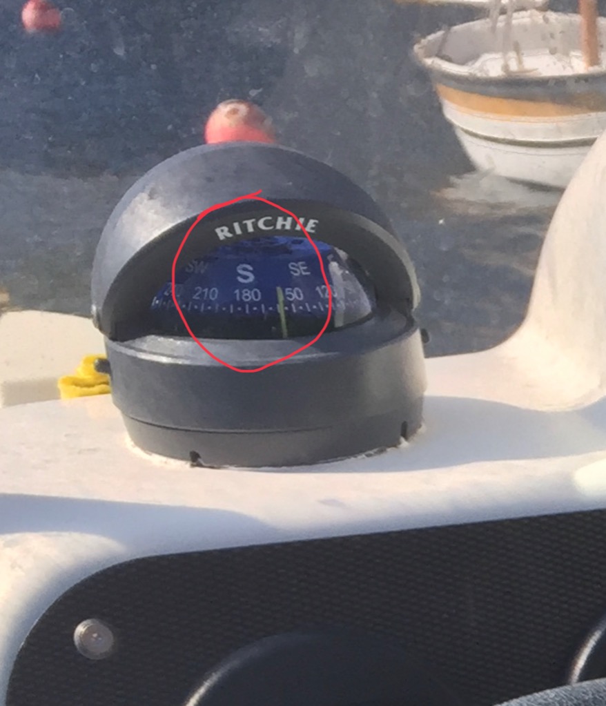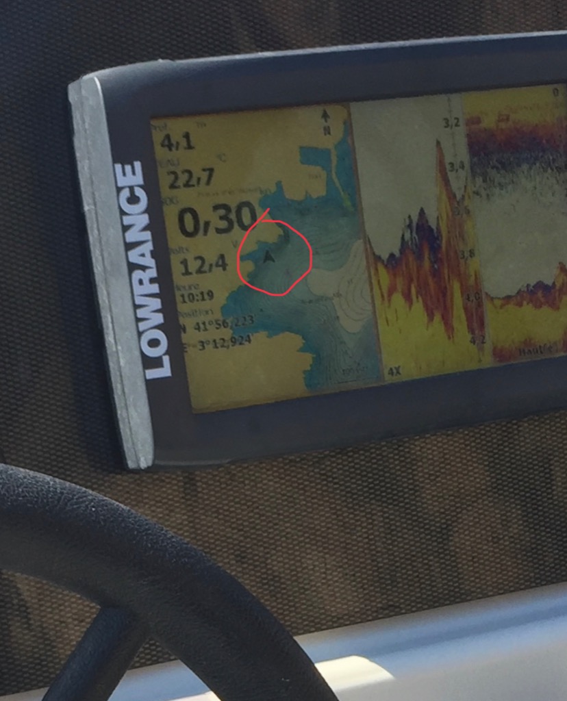 Notez qu’à l’arrêt ici au corps-mort le bateau est nez au vent plein sud. Le gps indique exactement l’inverse...