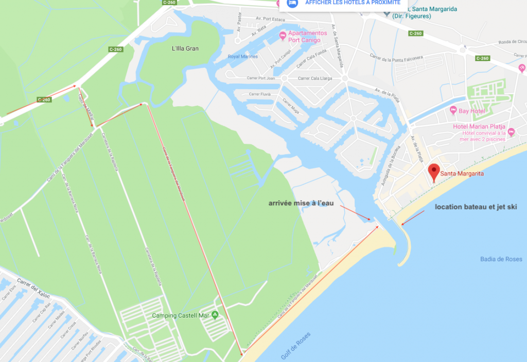 en fait , vous tomber en face du chenal de la marina ou sortent tous les bateaux et jet ski. vous pourrez laisser la voiture sur place avec la remorque.