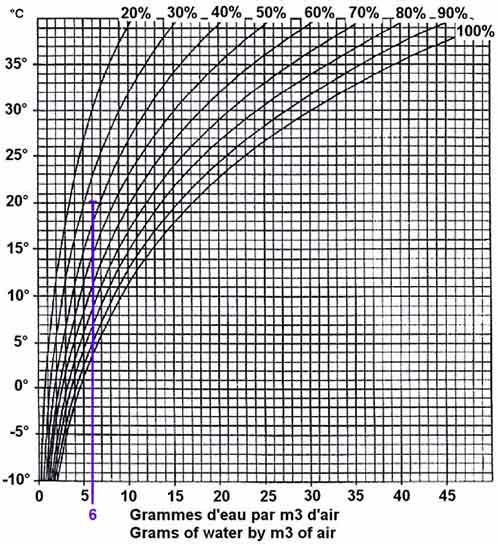 si notre m3 d'air à 20° et 35% HR (c'est sec, 35% HR ....) qui contient donc 6 grammes d'eau se réchauffe, l'HR va diminuer (20% à 29°c).