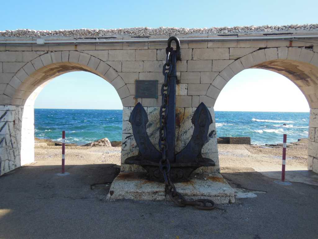 Sur le port d'Otranto, derrière l'ancre de ce bateau ( le Cavtat )qui a coulé le 14 juillet 1974, avec plus de 100marins à bord se trouve à 43 miles au large, au cap 114, l'île d'Othonoï ,avant garde de Corfou ::K+)