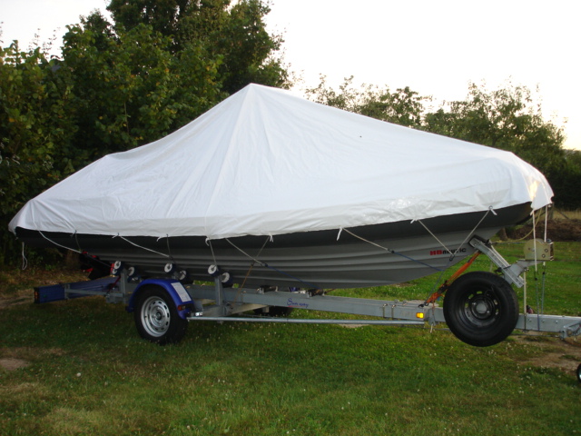 Mon taud de de route et hivernage est en cette bâche sur mesure du boat (voir PP photo de l'attelage)collée à la colle pour PVC avec rivets allongés pour passer une sangle de 3 cm et le pourtour est renforcé par un cable de fil à linge pris dans l'ourlet .