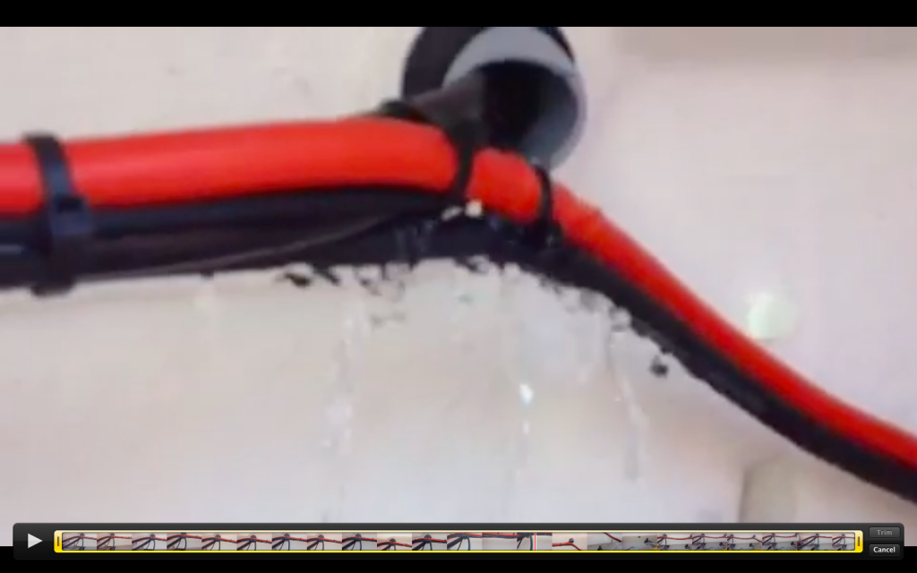L'eau rentrait par les passe-coque des gaines moteur (pas par les tuyaux des vide-coques, qui par ailleurs fuient legerement, mais ca ne peut expliquer les quantites d'eau rentrees).