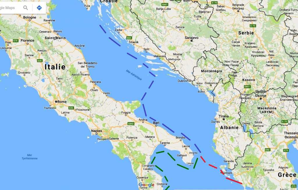 Je pense que les compères ont donné leur impression sur la côte italienne pourquoi ne pas faire ton programme en descendant comme tu le prévois sur ta ligne bleue puis faire le trajet en rouge passer par les Ioniennes jusque dans le Péloponnèse puis retour en passant soit par le sud (j'ai de très grosses interrogations sur ce contournement qui est très exposé) ou retour de nouveau par le canal de Corinthe (quand on aime on ne compte pas ...) puis remontée par l'Albanie et le Monténégro pour arriver sur la Croatie.