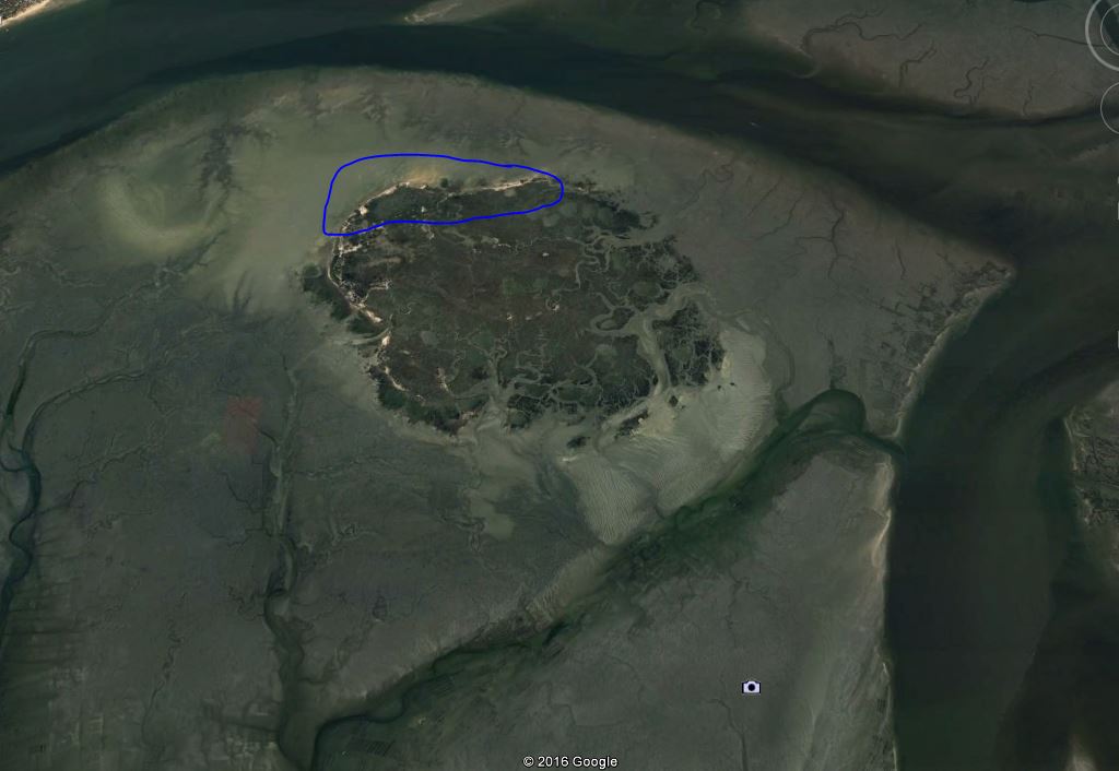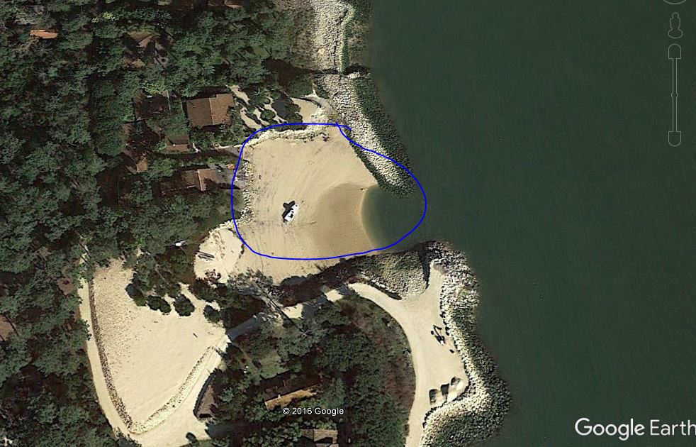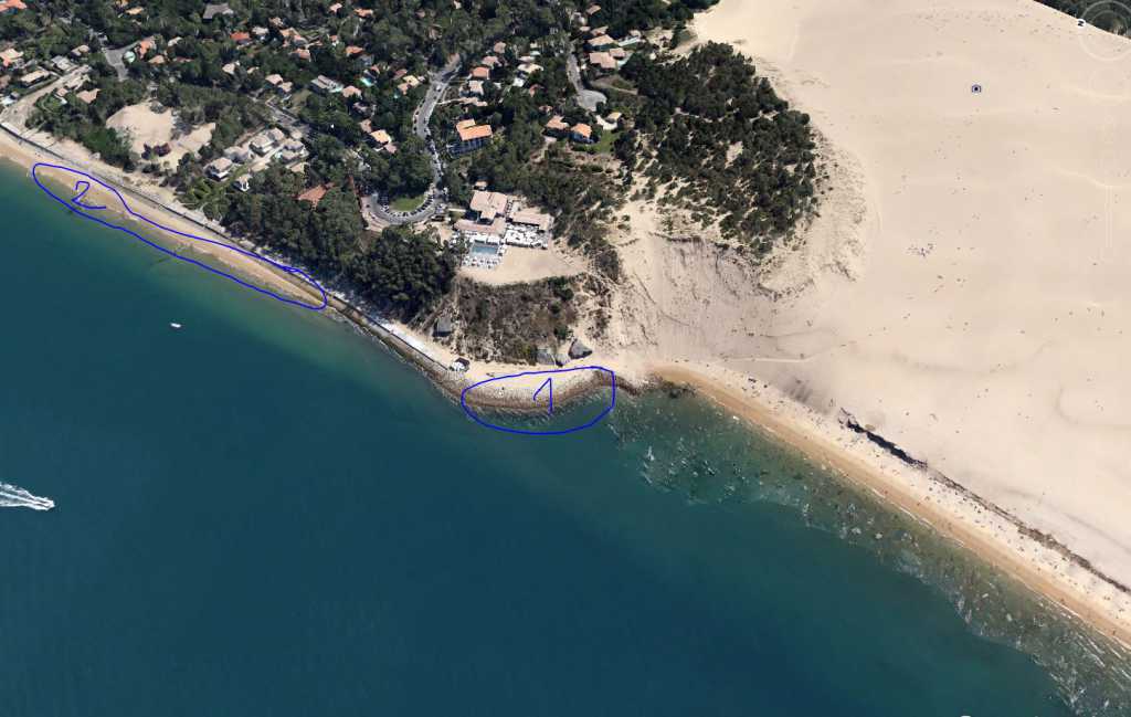 - J'aimerai aussi accoster coté dune du pila pour que les enfants puisse tenter de la montée par la face ouest. Si joint un vue (toujours de Google Earh ....). j'ai le droit de mouiller aux endroits entourés en bleus ? Quels sont vos conseils ?