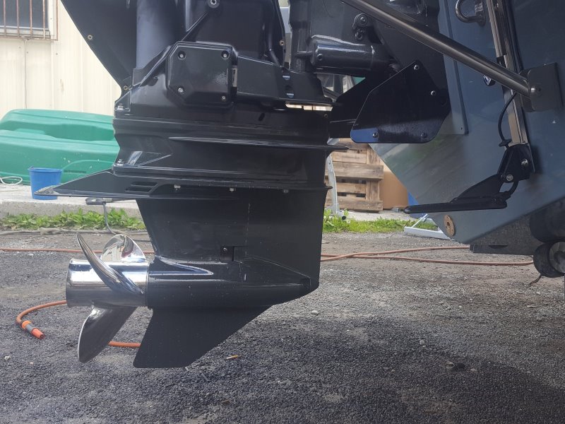 Bon sinon, Axellou a touché l'eau hier après-midi pour aller faire ses premiers runs. Il y avait 150 litres d'essence, il manque la deuxième batterie, tout le bordel qu'on embarque sur un bateau, et 2 personnes à bord. Le moteur est monté à environ + 10 cm (voir photo).