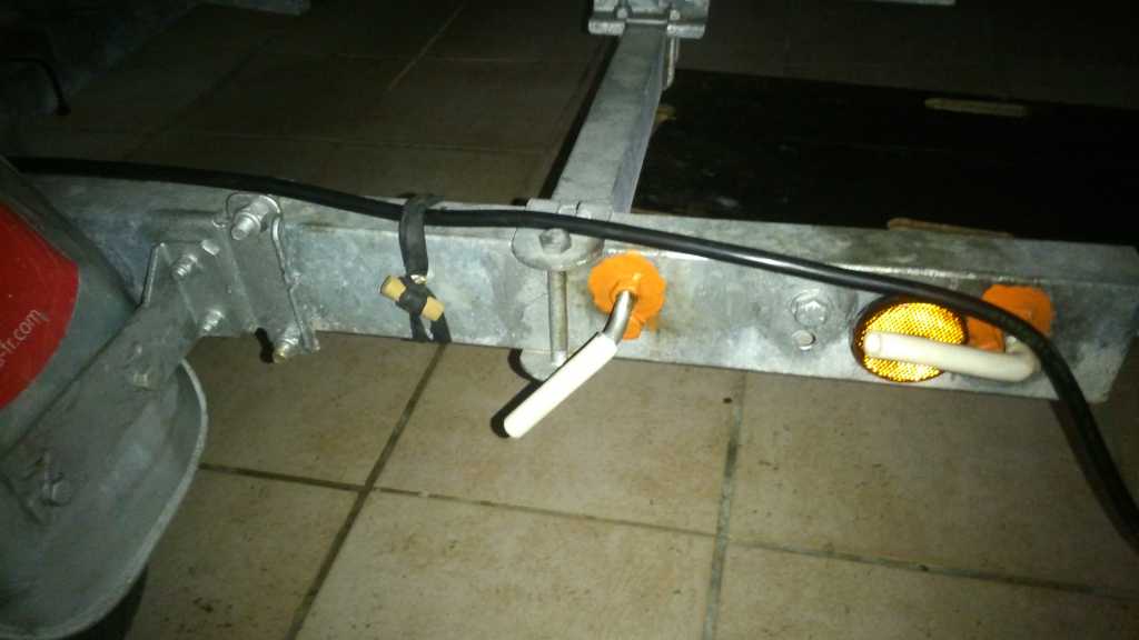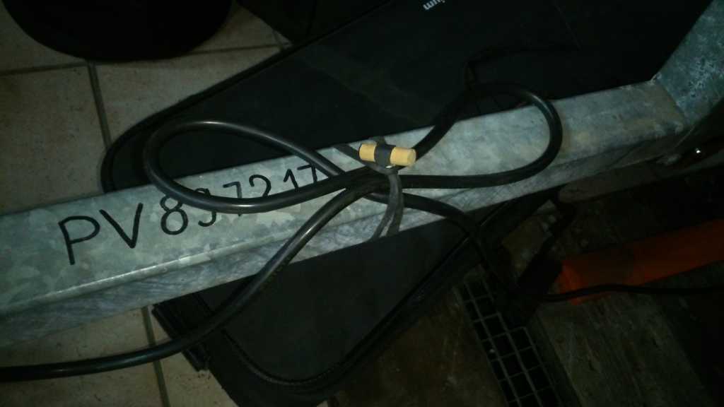 Une petite astuce pour plier le cable d'alim, une astuce pour le fixer à la remorque et dernièrement au lieu de le sangler sur les boudins une chaine INDISPENSABLE à l'avant et un crochet à l'arrière qui relie la remorque au moteur.