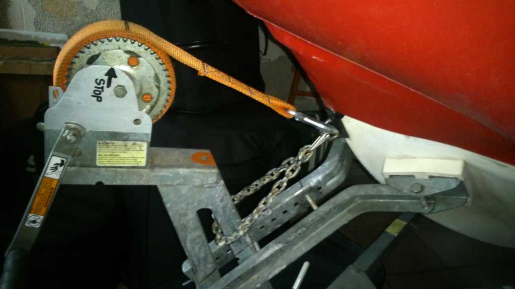 Le système à l'arrière, intéressant. Moi je met 2 sangles à cliquet attachées aux anneaux de levage du bateau.