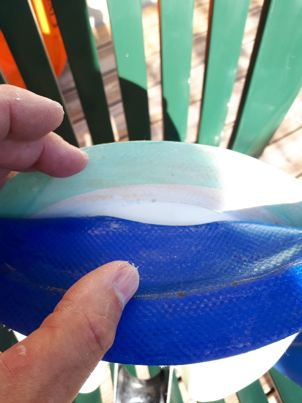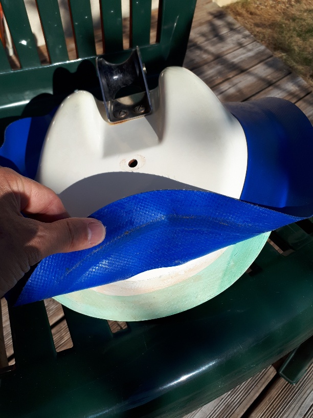 Une fois le davier décollé, j'ai remarqué une bande bleue coté polyester sur la largeur encollée en usine (et en retour coté intérieur).
