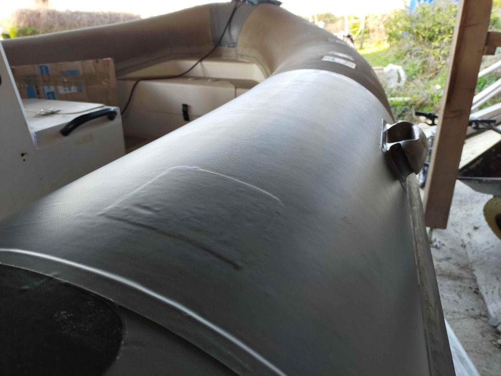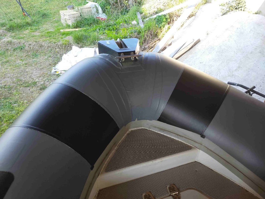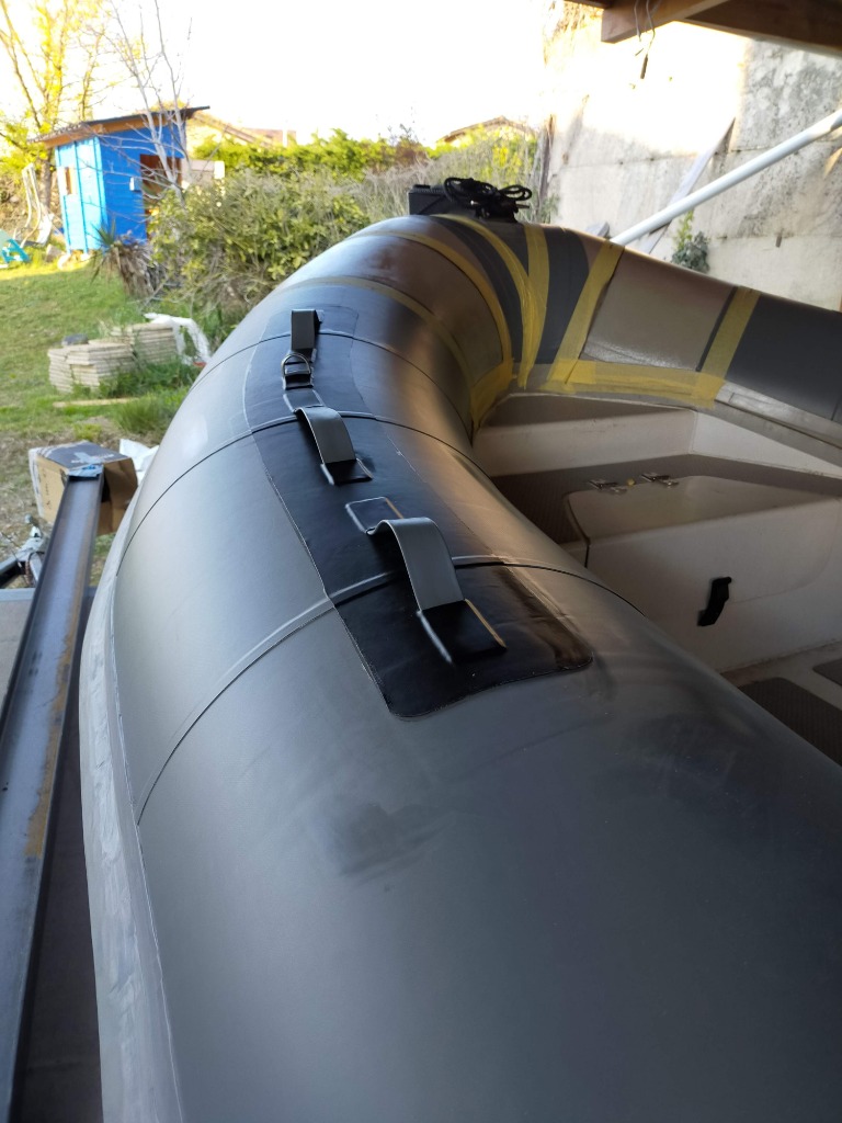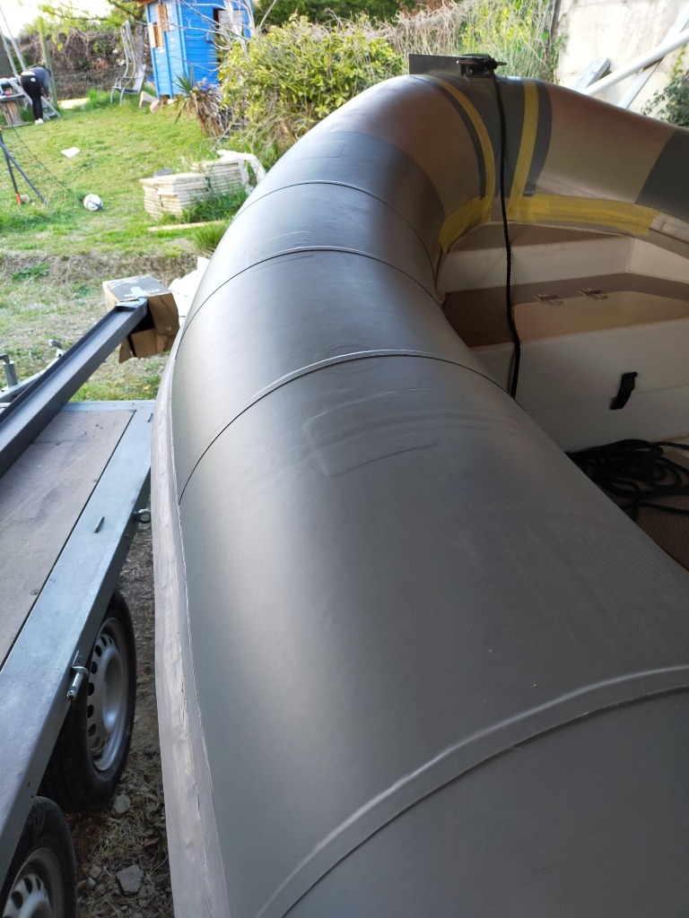 J ai fais les cônes avec un reste de tissu PVC qu'il me restait . Il est légèrement différent en aspect et en couleur. A la lumière du jour on voit bien moins la différence. Ça me choque pas le but étant de avoir une surface "neuve" moins fragile et salissante. Le bateau est stocker à l l'ombre d un grand abri bois.