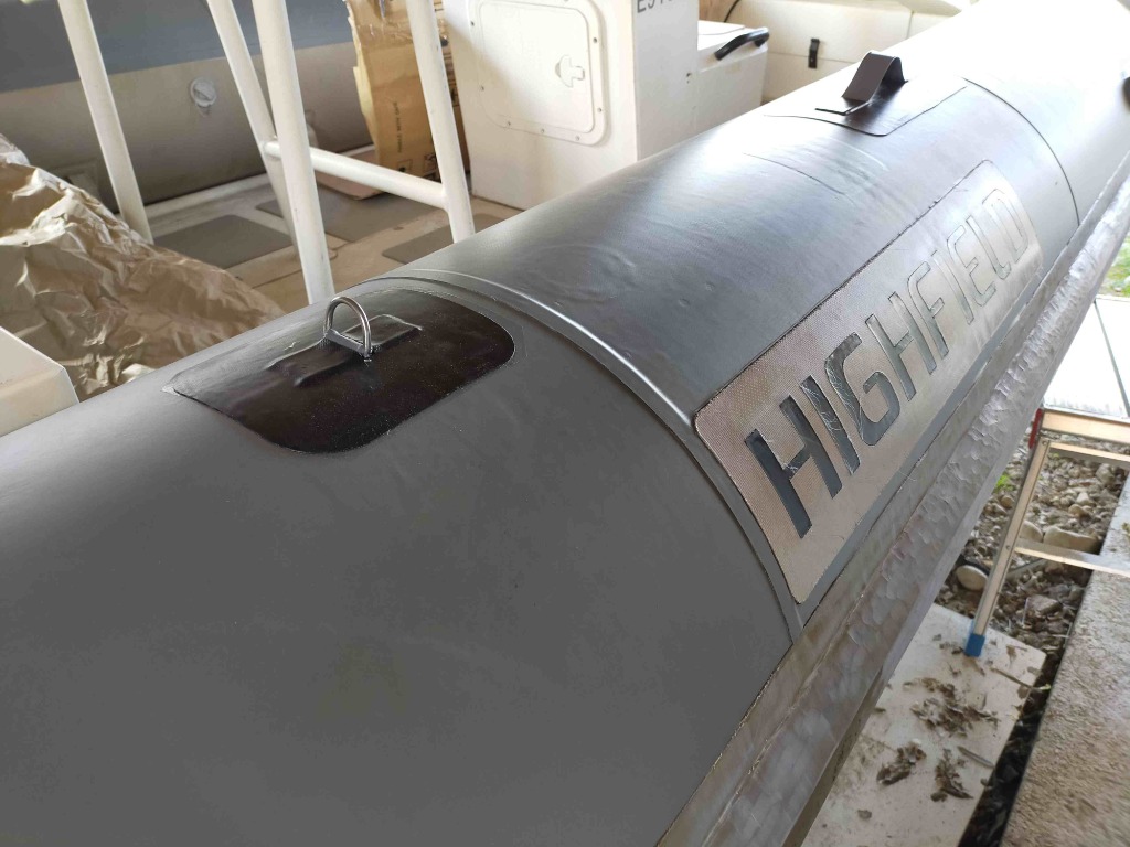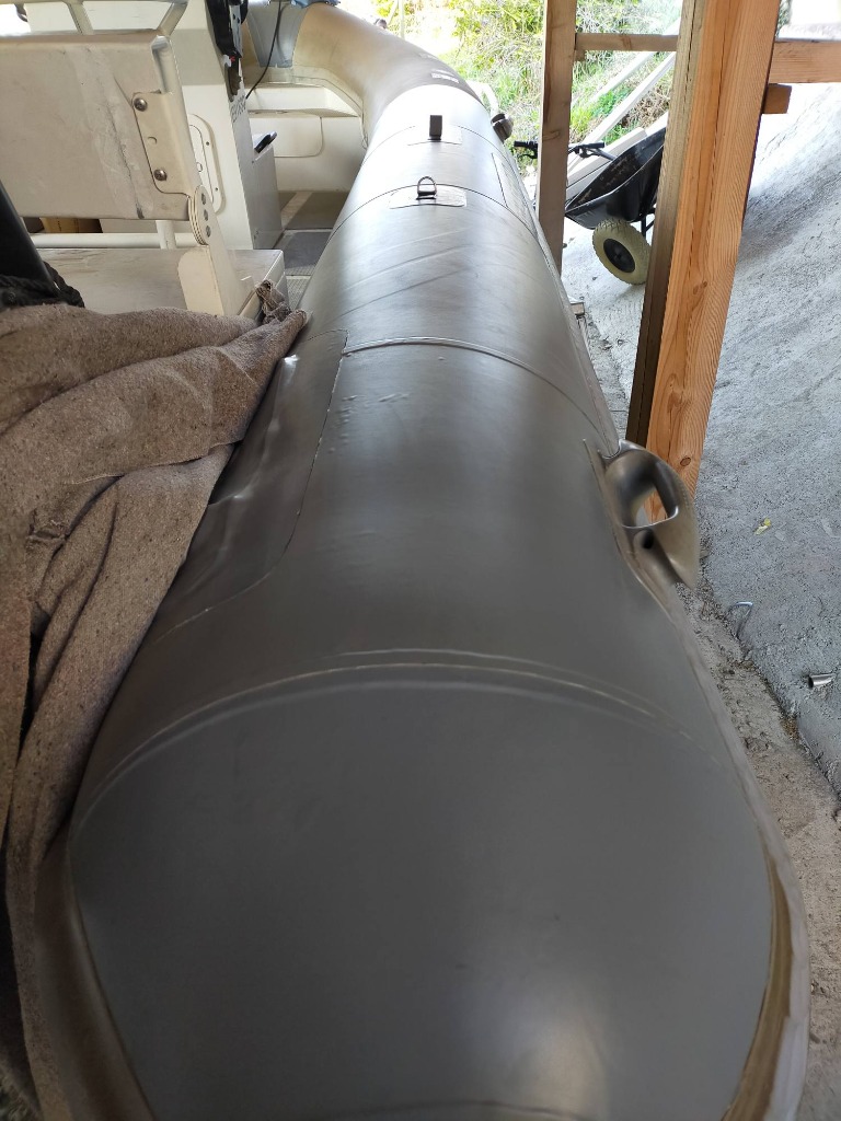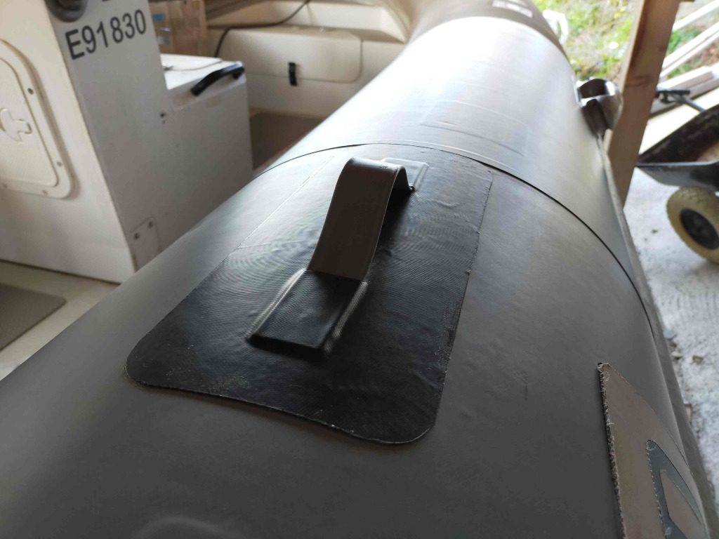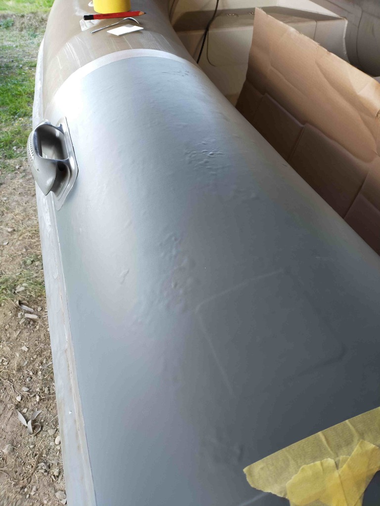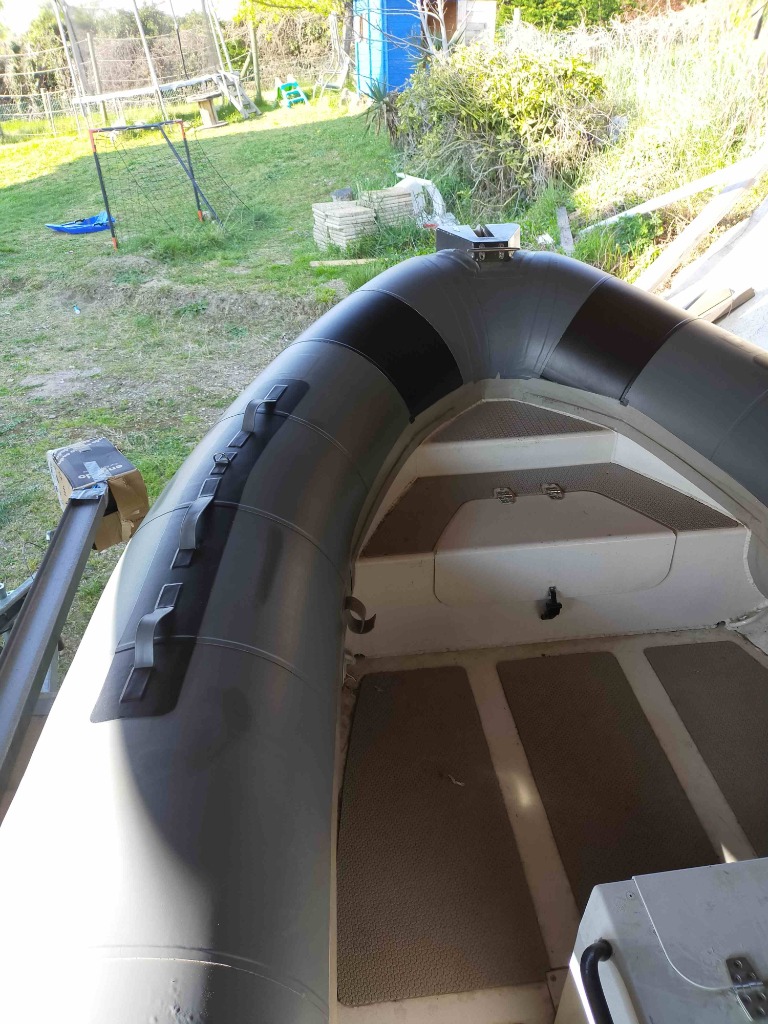 J ai fais les cônes avec un reste de tissu PVC qu'il me restait . Il est légèrement différent en aspect et en couleur. A la lumière du jour on voit bien moins la différence. Ça me choque pas le but étant de avoir une surface "neuve" moins fragile et salissante. Le bateau est stocker à l l'ombre d un grand abri bois.