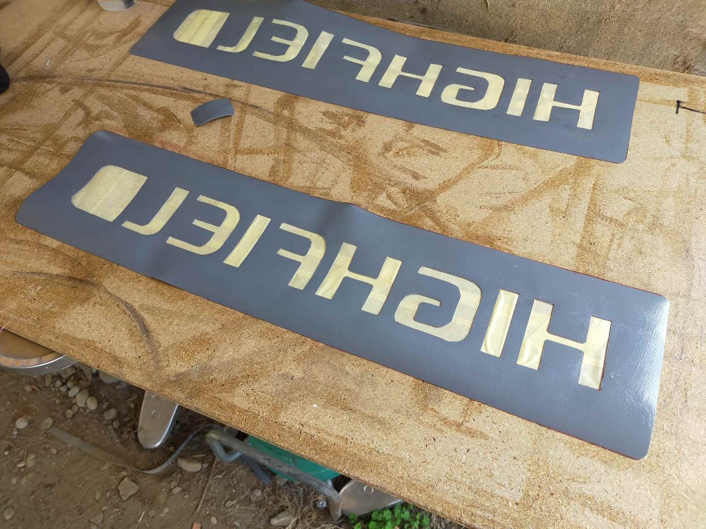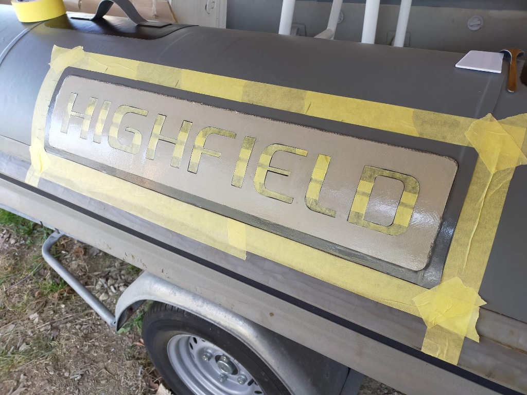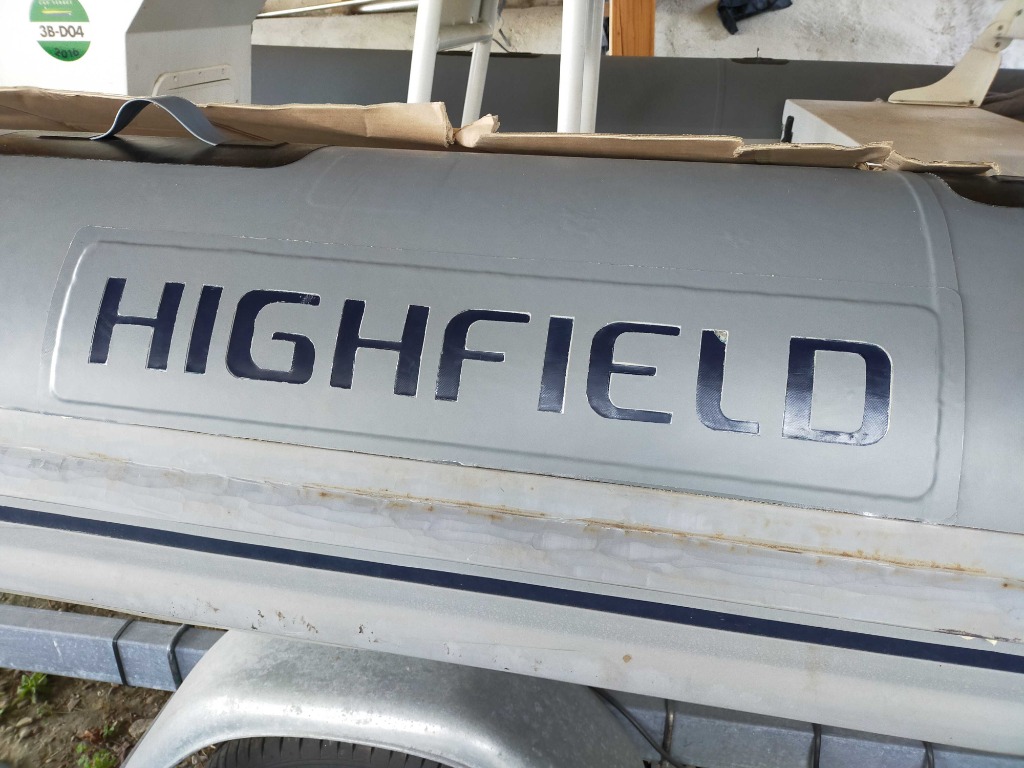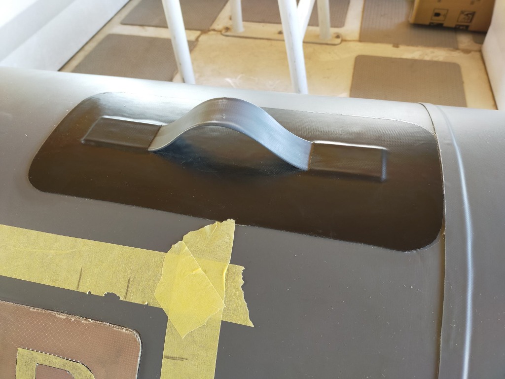 Suite... Pose de plusieurs morceaux,. Super content de moi, par contre je pense que j'ai eu un pour de colle pu 520 défaillant... J' ai un seul morceau qui a bullé... Bref ça tient mais c'est moins beau... Pose de poignées fabrication maison, pose d'anneau de fixation taud de soleil. Logo en cour de remise à neuf. Il faut que je trouve un support pour le pied du taud.
