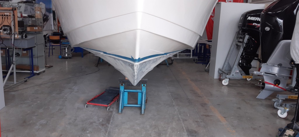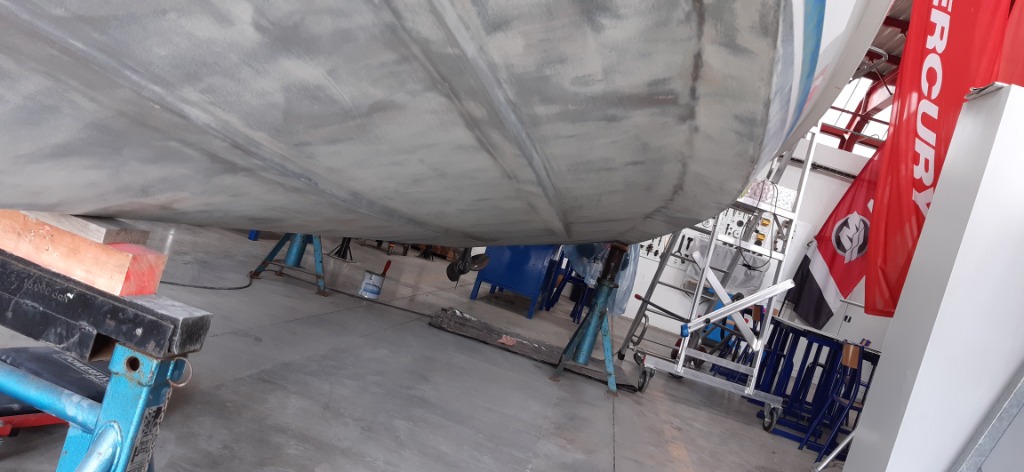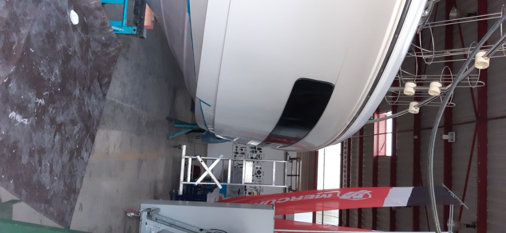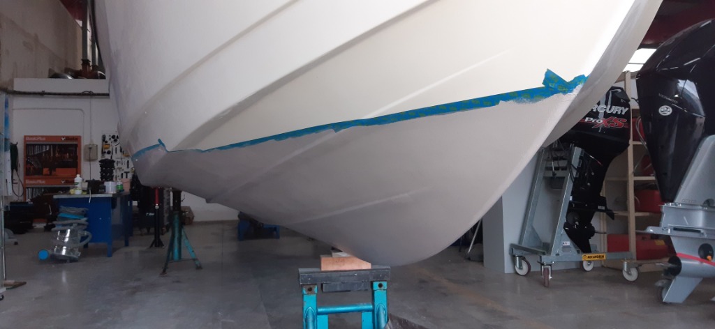 Coque: retouches primaire epoxy sur les traces de gel coat apparentes, et réhausse de la ligne de flottaison à l'avant, trop basse à l'origine
