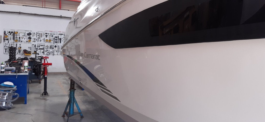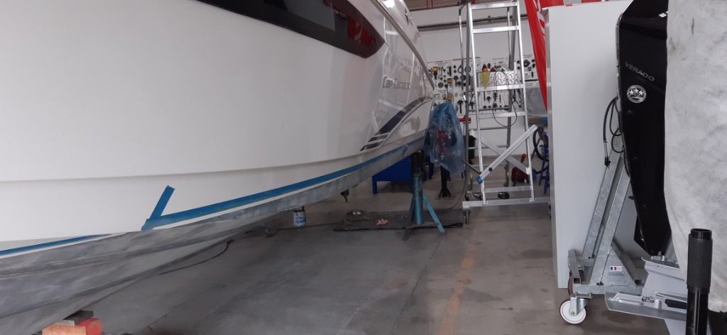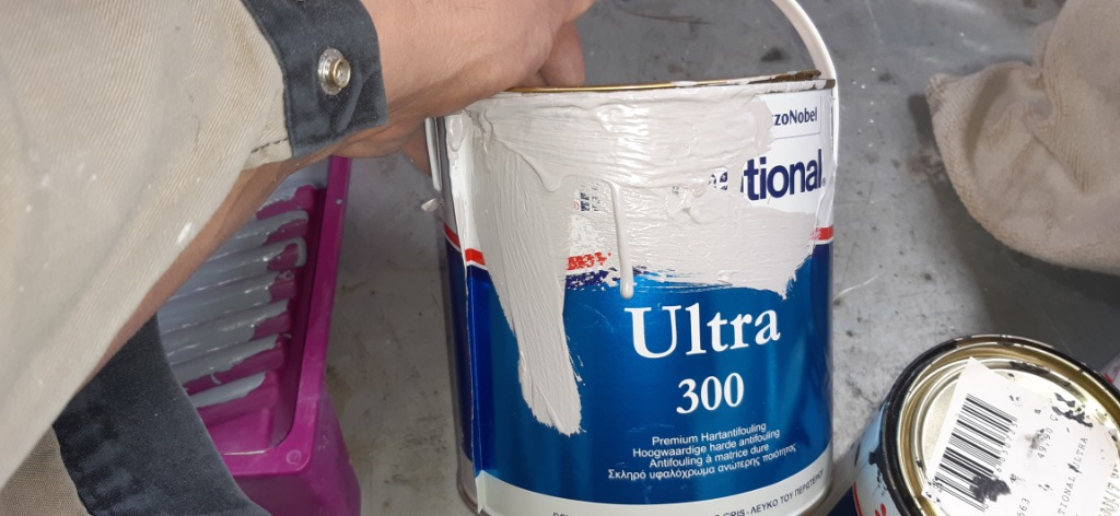 Une 2ème couche sur les flancs de coque, le tableau arrière et à l'avant de la carène à été appliquée, ce sont les endroits qui salissent le plus.