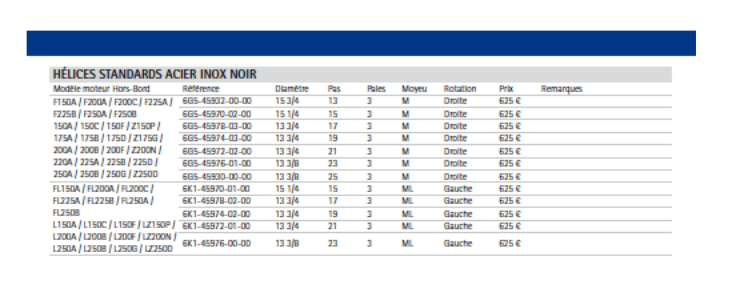 Une hélice Mercury adaptable sur un Yamaha 150 ? Possible, mais je n'en suis pas sur du tout, faut se renseigner pour en etre certain...je ne possède pas de Yamaha 4 cylindres avec cette classe d'hélices ( diametre de l'axe, nombre de cannelures etc...et c'est dommage par ce que c'est Mercury qui présente le plus grand choix d'hélices en inox et de loin !